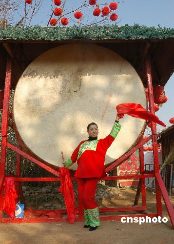 2009年春节正月初一至初六,来自湖南德夯的“第四代苗鼓王”龙菊献再次受邀来到中原,在郑州国家森林公园民俗庙会上为郑州市民献艺。中新社发 贾建伟 摄