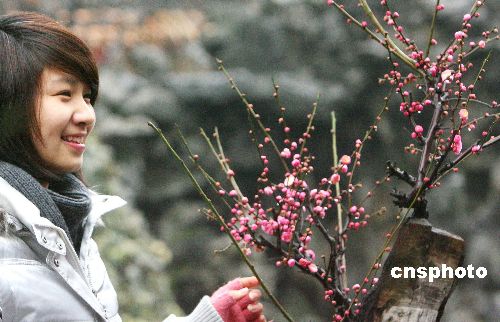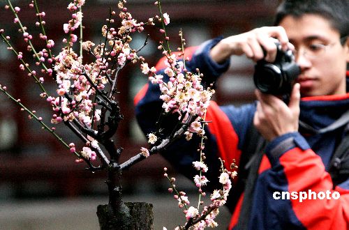 1月29日,一名游客在苏州狮子林内拍摄梅花盆景。为期1个月的苏州园林“迎春梅花展”目前正在古典园林狮子林举办,共展出的近百盆不同品种的梅花盆景姹紫嫣红,竞相绽放,为新春节日期间的古典园林增添靓色,吸引许多中外游客及摄影爱好者游园赏梅。中新社发 王建中 摄