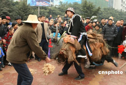 1月30日,农历正月初五,四川省洪雅县瓦屋山镇复兴村84岁村民毛清全带领该村10多名村民,到眉山市城区表演当地民俗“牛儿灯”。