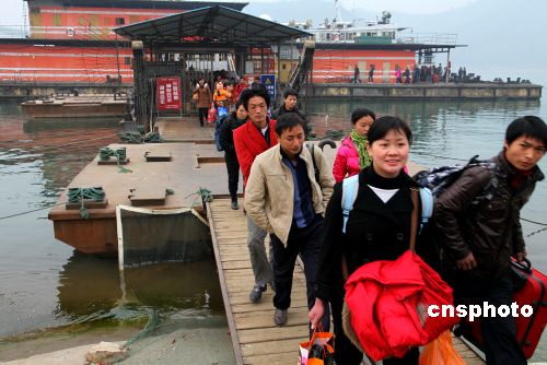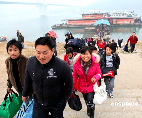 2月1日,47艘客船、高速客船出川,1.5万多名出川农民工返城,三峡库区迎来节后春运首次高峰,海事、公安、港口加大出川旅客进港秩序维护,没有一艘客船出现超载。中新社发 望作信 摄