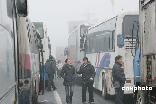 2009年2月1日上午,在同三高速公路江苏省赣榆县出口处,车辆等待雾散通行。连日来,江苏省大部分地区遭遇持续大雾天气,部分地区能见度不足50米,给旅客出行及运输带来影响。当地气象部门发布大雾黄色预警,交通安全部门提醒旅客要注意出行安全。中新社发 司伟 摄