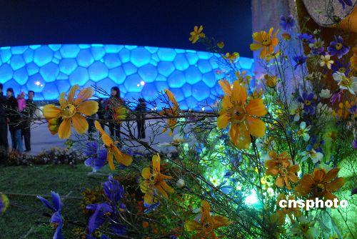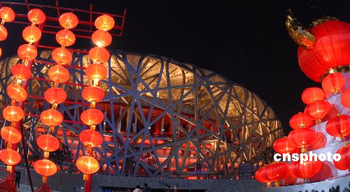 2009年1月31日晚,北京奥林匹克公园迎来的首个春节已过半,但喜庆气氛依然高涨,游人络绎不绝。最为醒目的是景观大道两侧布置两组15米高的灯笼墙——2800个大红灯笼一字排开。此外,“金牛献福”、“年年有余”、“鸿福满仓”等钢材结构的雕塑,被安放在园区人流较集中的地方。中新社发 胡庆明 摄