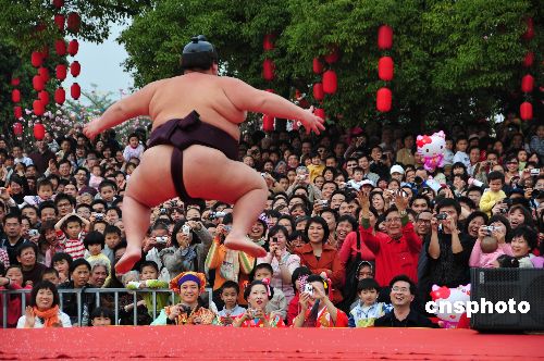 2009年2月1日,日本相扑手为广大游客表演。第二届广州(番禺)樱花文化节自1月26日在大夫山森林公园开幕以来,每天吸引数万游人。活动除了有姹紫嫣红的樱花观赏外,还有丰富多彩的表演。本届樱花文化节将于3月15日闭幕,历时49天。中新社发 盘石 摄