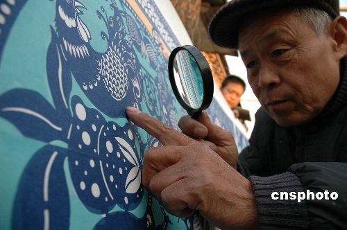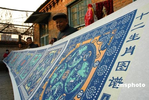 2009年2月4日,世界第一幅蓝印花布剪纸长卷亮相山东滨州博兴。该卷名为《十二生肖图谱》,长12米、宽1米,采用浓郁地方特色的蓝印花布剪制而成,其制做手法为世界首创。据62岁的蓝印花布剪纸发明者耿延祯介绍:蓝印花布是祖传的手艺,剪纸是他几十年来研究的课题。在一次偶然的机会,他发现蓝印花布所用的刻版跟剪纸的原理几乎一样,于是他把剪纸与蓝印花布工艺结合,创造出了印花布剪纸技术。这次耗时4个月完成的蓝印花布剪纸作品《十二生肖图》,12种生肖动物图案形态各异、设计巧妙、造型别致,无论在创作题材、造型还是色彩运用上,粗犷写意,色彩艳丽,表现出浓郁的乡土气息,热烈喜庆。中新社发 梁宝海 摄