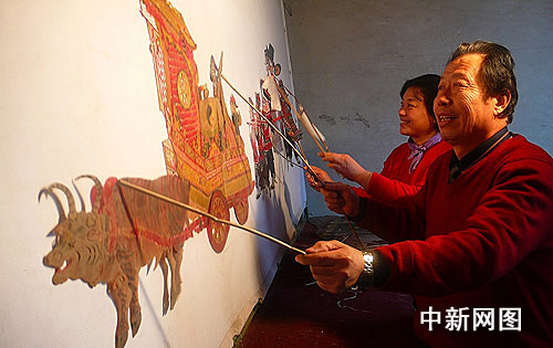 中新网2月6日电(冯文芳)2月5日,山西省侯马市西侯马村,皮影戏传承人李世伟、皮影雕刻大师赵翠莲夫妇耍起牛车和影人,表演皮影戏《闹社火》,庆祝传统元宵佳节。夫妇俩边操作边演唱,字正腔圆的唱段、妙趣横生的台词、活灵活现的表演,受到乡亲们的欢迎。人们纷纷落座观看,尽情享受这一独具魅力的民间文化大餐。