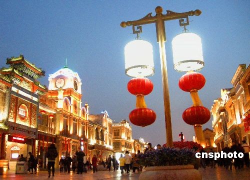 2009年2月7日(农历正月十三),大红灯笼悬挂北京前门大街,迎接元宵佳节到来。据悉,2月9日(农历正月十五),前门大街将举行元宵节踩街活动,来自北京、河北、山东的花会队,将从正阳门箭楼南侧和前门五牌楼之间被彩绸包围的“仪式场”出发。16只南狮和北狮将为大队人马开道,随后,中幡、旱船、二魁摔跤、地秧歌、鼓子秧歌等将依次向珠市口行进。中新社发 玉龙 摄