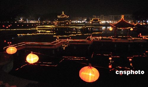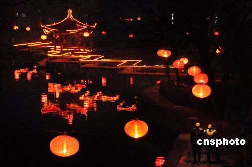 2月7日晚在山东省枣庄市山亭区太清湖公园内拍摄的元宵灯海。连日来,山东省枣庄市山亭区太清湖公园内张灯结彩,喜迎元宵佳节。夜幕下的湖中倒影璀璨缤纷,整个公园仿佛灯的海洋。中新社发 李宗宪 摄