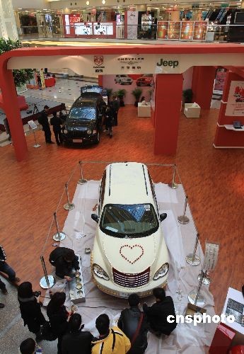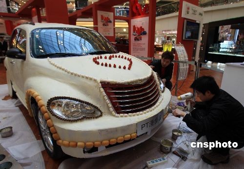 2月8日,上海两位巧克力工艺师用两天的时间、超过200公斤白巧克力原料,精心打造一款时尚酷车,浪漫约会即将到来的“情人节”。中新社发 潘索菲 摄