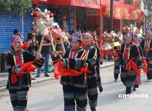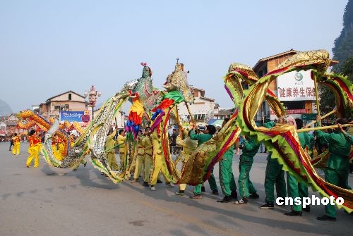 2月9日,是中国传统佳节元宵节,广西阳朔县民间龙狮、排灯队沿叠翠路、西街等路段巡游,龙狮欢跳度元宵。具有浓郁地方特色的民间艺术表演,看得中外游人如醉如痴,流连忘返。中新社发 周利朔 摄