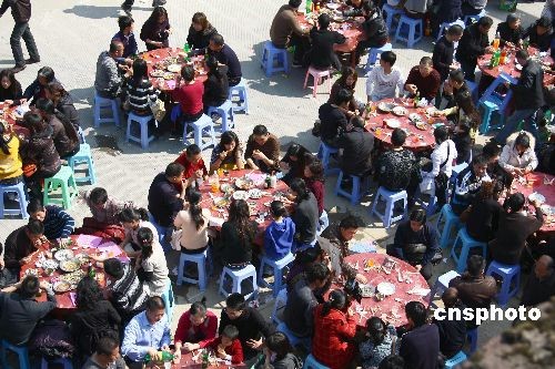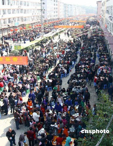 图为位于雅阳的两千多桌宴席。2月9日,中国传统的元宵节,在浙江省泰顺县,在这一天就会邀请四方的宾客相聚在洲岭、雅阳、西旸等地。今年雅阳的“百家宴”历史以来规模也是最大的一次,达到一千多桌,一万多人,且和文化旅游相组合,推出了许多的节目。现在,“百家宴”已经成为一种带有民间联谊性质的活动,人们欢聚一堂联络感情,互送祝福,谱写盛世和谐新篇章。中新社发 镐玺 摄