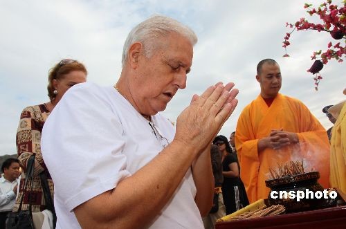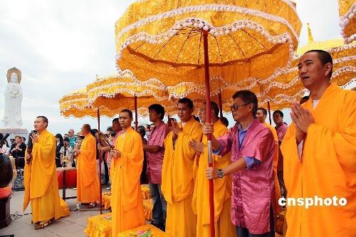2月9日元宵节,海南三亚南山寺全体僧众在三亚南山文化旅游区内的108米南海观音圣像前举行祈福法会,共唱佛赞,并放飞和平鸽,祈愿国泰民安、万家团圆。本次祈福法会吸引了近3000多名信众和游客参加。中新社发 陈文武 摄
