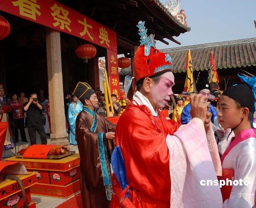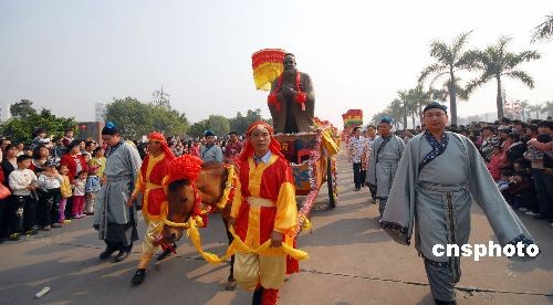 2月9日,广东德庆依古制进行公祭、民祭仪式,万人肃穆,向孔子圣像朝拜,为该县闹元宵活动添上浓厚的儒家文化韵味。中新社发 谈细育 摄