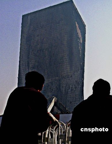 2月10日,两位北京市民在被烧毁的央视大楼北楼下驻足观看。9日晚,中央电视台新址配楼发生意外大火,六小时后明火被扑灭。中新社发 邹宪 摄