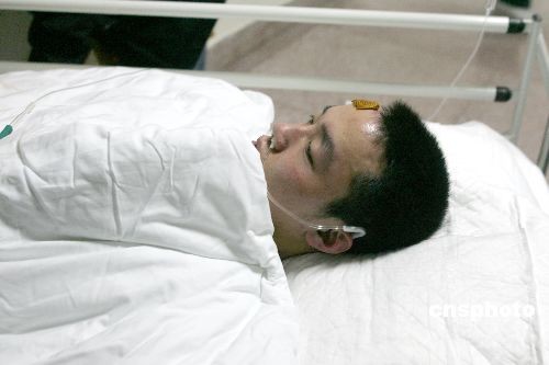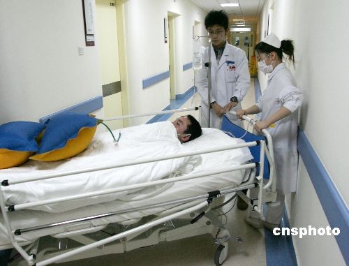 2月10日,6名在央视火灾事故中受伤的消防官兵在朝阳医院接受治疗。9日晚,中央电视台新址北配楼突发火灾,造成至少1人死亡7人受伤。据朝阳医院总指挥闫勇介绍,9日晚21时20分到10日凌晨,该院共接收7名伤员,其中1名伤员于10日凌晨1时40分左右因抢救无效死亡,其他伤员病情稳定。他表示,10日上午又有一名轻伤员转至该院。图为其中一名消防官兵被推出病房,接受检查治疗。中新社发 富田 摄