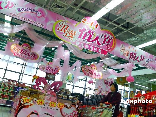 2月12日,上海一家超市内布置的“情人节”浪漫专区。距离情人节还有两天,上海商家的“甜蜜攻势”已经全面展开,有关情人节的各类商场布置和促销礼盒已一一登场。中新社发 井韦 摄