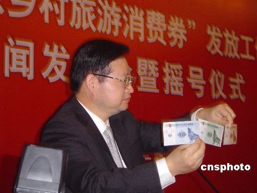2月16日,南京市向城区居民发放2000万元乡村旅游消费券以带动乡村游,在市民代表和公证部门监督下进行公开摇号,摇中的20万户居民每户获得100元旅游消费券,可在指定的该市37个乡村旅游点抵扣相应消费费用。图为摇号仪式上市旅游局官员展示旅游消费券样式。中新社发 王国安 摄