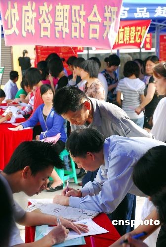 2009年2月16日,海南省就业局联合大型零售企业,在海口、三亚、澄迈等全省8个市县同时举行针对弱势群体的大型现场招聘会,专门招收下岗职工、失业人员、零就业家庭人员、大中专毕业待业青年和农民工。用人单位对聘用人员一律进行培训上岗,无论哪个工种的工资,都不低于所在市县的最低生活保障金,且到岗就给购买各项保险。中新社发 善平 摄