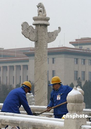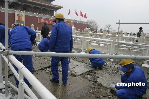 2009年2月18日,为迎接新中国成立60周年,天安门管委会开始对金水桥实施保护修缮工作,工程拟于2009年5月1日前完工,并整体对外开放。据悉,此次修缮工作将分阶段进行,由于施工围挡防火板高度有限,因此金水桥和天安门城楼的整体景观和游览不会受到太大影响。中新社发 鲁谷 摄