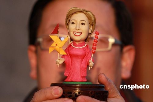 2月20日,中国非物质文化遗产项目传承人“面人彭”彭小平展示他精心制作的面人新作品--美国国务卿希拉里。当日,美国新任国务卿希拉里结束访韩行程,开始她亚洲四国之行的最后一站--中国。此次亚洲之行是希拉里出任奥巴马政府国务卿以来首次外交出访,希拉里的访华受到北京市民的关注。中新社发 郑雄增 摄