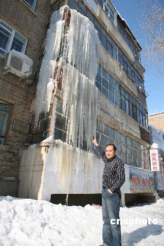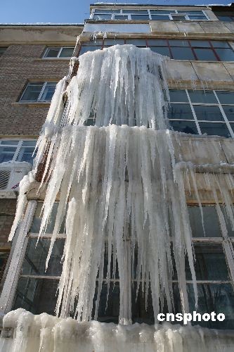 2月22日,在新疆阿勒泰市团结南路一居民楼上惊现壮观的冰瀑奇观,家住此楼的宋正国等四户居民身受其扰。居民楼共四层冰瀑一直从三楼垂到一楼,十分壮观。中新社发 唐晓波 摄