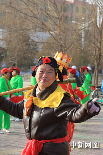 2月13日,嘉峪关市前进路街道社区,一位身着“猪八戒”服饰的妇女在秧歌队中尤其显眼。近年来,嘉峪关投资为每个社区都建立了文化活动室和休闲娱乐区。