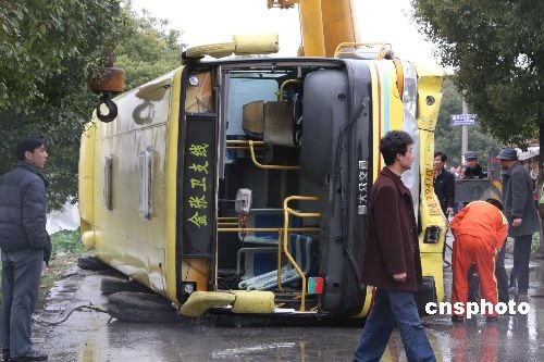 2月24日,上海金山区金山卫镇秦弯路上,一辆承载多名乘客的公交车不慎冲入河道内,大批乘客被河水淹没。乘客和司机迅速展开自救行动,最终全部脱离险境。图为发生事故的公交车被打捞上岸,车窗玻璃破损严重,吊车、警车正在现场进行牵引工作。据了解,事故可能与金张卫支线公交车车速过快、避让不及有关。中新社发 沪选 摄