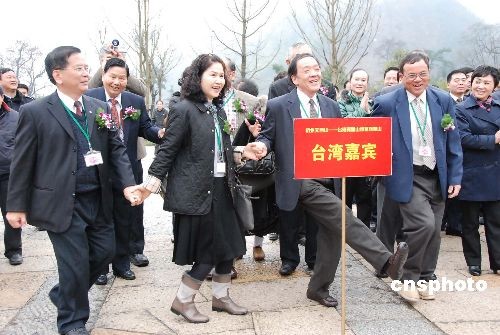 2009年2月24日上午,在浙江省杭州市天目山山脚下,天目山与阿里山的代表举行了“杭州天目山——台湾阿里山缔盟姐妹山”合约签字仪式,联手推介旅游项目。在仪式现场代表们手拉手跳起了阿里山的传统舞蹈。中新社发 姜越潮 摄