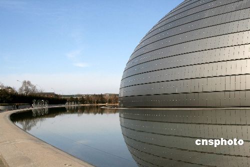 2009年2月25日,国家大剧院外表被清洗的焕然一新,喜迎“两会”的召开。中新社发 任丘 摄