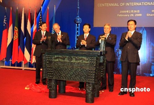 2009年2月26日,“万国禁烟会”百年纪念活动在上海举行,来自泰国、英国、美国、越南等16个国家的政府代表团以及联合国毒品和犯罪问题办公室、国际麻醉品管制局代表出席。中国国务委员、公安部部长孟建柱(中)与参会代表一起为“万国禁烟会”百年纪念鼎揭幕。中新社发 汤彦俊 摄