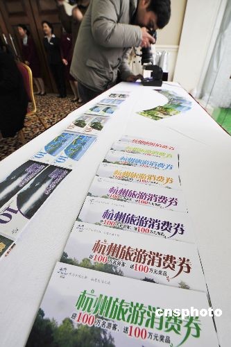 2月26日,杭州市宣布“杭州旅游消费券”发放及使用说明,并开始正式面向以长三角地区为重点的国内及港澳台旅游市场免费发放240万份总面值为1.5亿元的“杭州旅游消费券”,从2009年3月1日起至5月31日止,持券游客来杭旅游可在指定商家使用并享受相应的优惠。 中新社发 李忠 摄