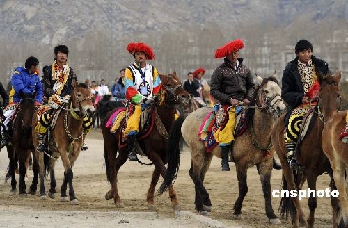 2月27日,中国藏历年初三,拉萨赛马场,传统赛马与表演活动开幕,参赛选手身穿传统民族服装亮相。中新社发 廖攀 摄
