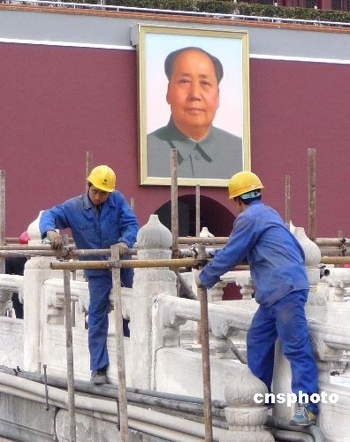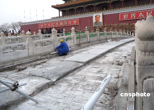 2009年2月26日,北京天安门金水桥上的施工人员正在搭建绞手架,为搭设围挡及桥面铺设青砖的工作做准备。据悉,天安门金水桥修缮工程将全部剔除品级桥混凝土罩面,恢复传统青砖。同时,在桥上架设栈道,栈道将满铺木板,能够承受游人活动等所产生的荷载强度等。 中新社发 玉龙 摄