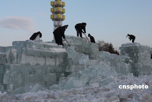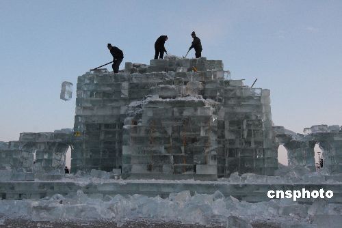 2月28日,施工人员在牡丹江市城区冰堡旅游景点拆除融化的冰雕作品。“立春”过后,素有“雪城”之称的黑龙江省牡丹江市气温回升较快,城区内的各大冰雪旅游景点的冰雪作品开始融化,失去寒冬里的风采。从当日起,城区冰雪旅游景点管理部门对融化的冰雕作品进行拆除。中新社发 庄文斌 摄