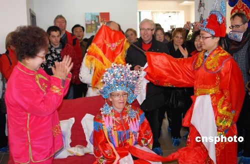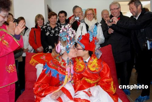 3月1日,江苏镇江市永安新城小区的乔樑迎娶比利时姑娘多娜。据了解,乔樑是在留学比利时期间与校友多娜相识、相恋、相爱走到了一起,两人商议在中国举行婚礼的想法得到双方父母支持,多娜的20多位亲友也从比利时随行来中国参加了婚礼活动。中新社发 陈岗 摄