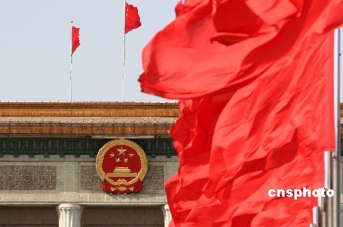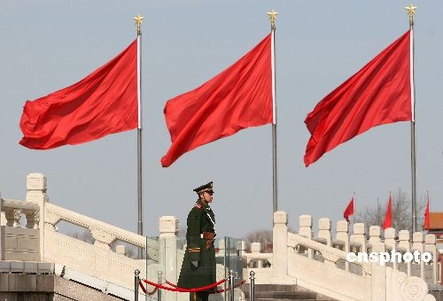 2009年3月1日,“两会”即将召开,北京天安门广场及周边建筑挂起了红旗,广场上一片喜庆祥和气氛。中新社发 鲁谷 摄