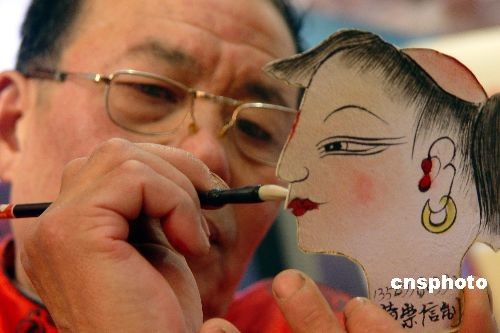 3月2日,一位来自河南罗山的民间艺人现场制作并“秀”皮影戏道具,向观众推介河南。当日,设在北京全国农业展览馆的“河南农民工风采展”揭开帷幕。中新社发 李志全 摄