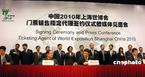 3月2日,中国移动、交通银行、香港中国旅行社、台湾中国旅行社、日本JTB公司等首批上海世博会境内外门票销售指定代理商与上海世博局签约,此举标志着上海世博会门票销售工作正式启动。3月27日起,上述机构开始正式受理团体购票。 中新社发 张帆 摄