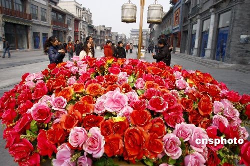 3月3日,随着“三八”妇女节的临近,北京前门大街用多彩的“绢花玫瑰”来装扮街景,市民和游客提前感受到浓浓的节日气氛。中新社发 郑雄增 摄