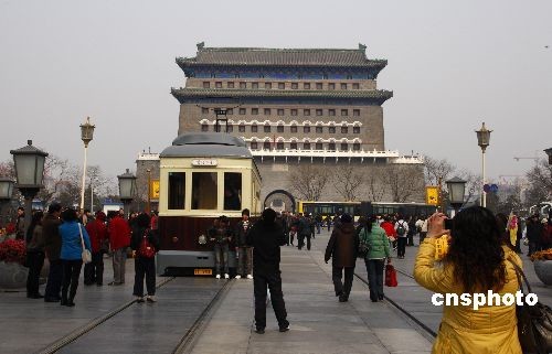 3月3日,全国政协十一届二次会议在北京人民大会堂开幕,北京前门大街迎来八方游客。中新社发 郑雄增 摄