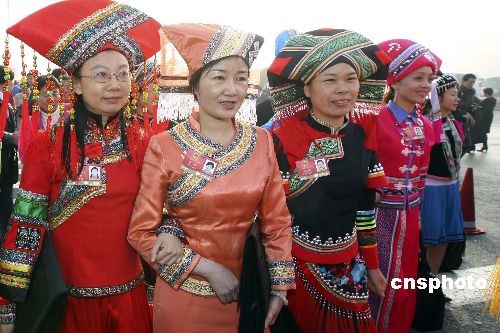 3月5日上午,十一届全国人大二次会议在北京人民大会堂开幕,来自广西的女代表手挽手步入会场。中新社发 盛佳鹏 摄
