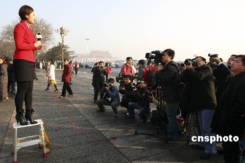 3月5日,十一届全国人大二次会议在北京人民大会堂开幕,登高报道新闻的电视台女主持人也成为摄影记者的聚焦中心。中新社发 盛佳鹏 摄