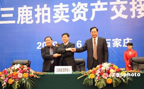 3月6日,石家庄三鹿集团管理人李爱民与北京三元集团董事长张福平、河北三元总经理高青山,在河北省石家庄亚太大酒店进行了拍卖资产交接协议签署仪式。图为签约仪式结束后,三人微笑握手。中新社发 翟羽佳 摄