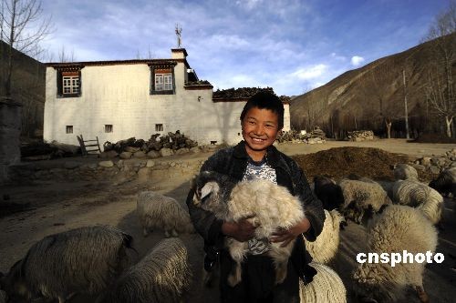 3月初,西藏尼木县吞巴乡的一名少年欢喜地抱着自家羊圈里的羊羔。该乡地处前藏和后藏的结合部,盛产藏香。中新社发 廖攀 摄