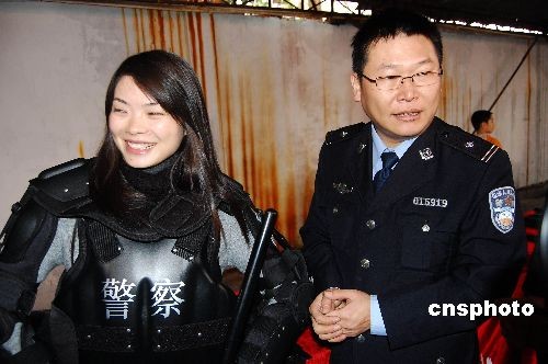 三月八日,国际妇女节,广州南沙区警方举行“警嫂警营体验日”活动,一位警嫂试穿老公的防爆衣英姿飒爽。中新社发 柯小军 摄