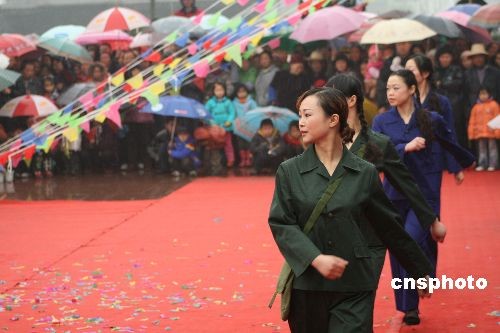 3月8日,四川丹棱县的农村姑娘冒雨进行时装秀表演。当日,四川丹棱县农耕文化展在该县丹棱镇兴隆村拉开帷幕,当地农村姑娘冒雨进行时装秀表演,在展示各个时期农村服装变化的同时,庆祝“三八”妇女节。中新社发 尧遥 摄