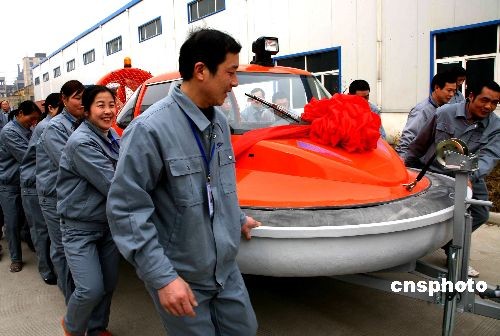 3月10日,国内首批国产气垫船在东海县成功下线后,4艘气垫船已到达黄河内蒙古段的凌讯排除第一线的冰凌区,执行“破凌”任务。 中新社发 魏爱华 摄