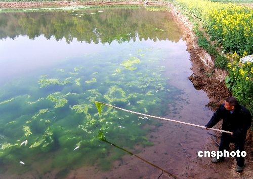 2009年3月10日,湖北省荆门市掇刀区麻城镇胡冲村农民郑家清承包的鱼塘暴发蓝藻,导致不久前投放的价值2000多元的鱼苗缺氧成批死亡。据郑家清称,他承包的16亩鱼塘近几年来在春夏时节不同程度的暴发蓝藻,需要用蓝矾(五水硫酸铜)才能将蓝藻灭掉。中新社发 刘君凤 摄
