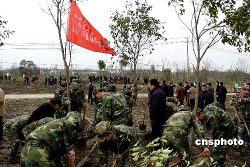 3月11日上午,植树节即将到来之际, 江苏省扬州市开展全民义务植树活动。江苏某预备役高炮师组织官兵到驻地参加义务植树。图为官兵在同当地市民共同种下白玉兰树。中新社发 田亚威 摄