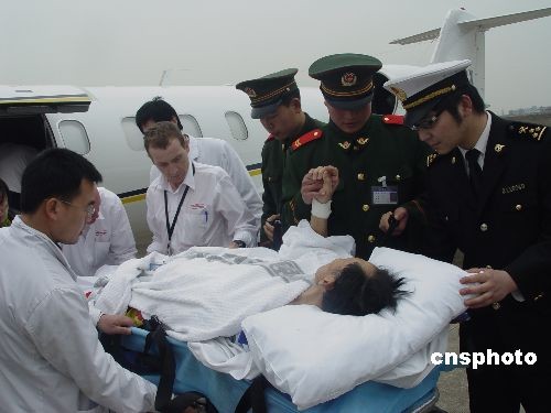 3月11日,浙江宁波栎社国际机场边检人员和机场工作人员将一名中国籍中风患者抬下救援飞机。患者姚仁贵在澳大利亚商务期间突发中风,需回国进行紧急治疗。接到消息后,中澳两地立即联手行动,宁波机场边检站迅速联合宁波栎社国际机场各联检单位,紧急启动“绿色生命通道”,于当天下午15时10分,将病人抬下救援飞机送往医院救治。中新社发 陈勇zj 摄
