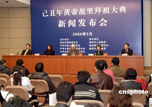 3月12日,中共郑州市委、郑州市人民政府、己丑年黄帝故里拜祖大典郑州市执委会在北京举行新闻发布会宣布:己丑年黄帝故里拜祖大典将于2009年3月29日在河南郑州市所辖的新郑黄帝故里隆重举行。中新社发 李刚 摄